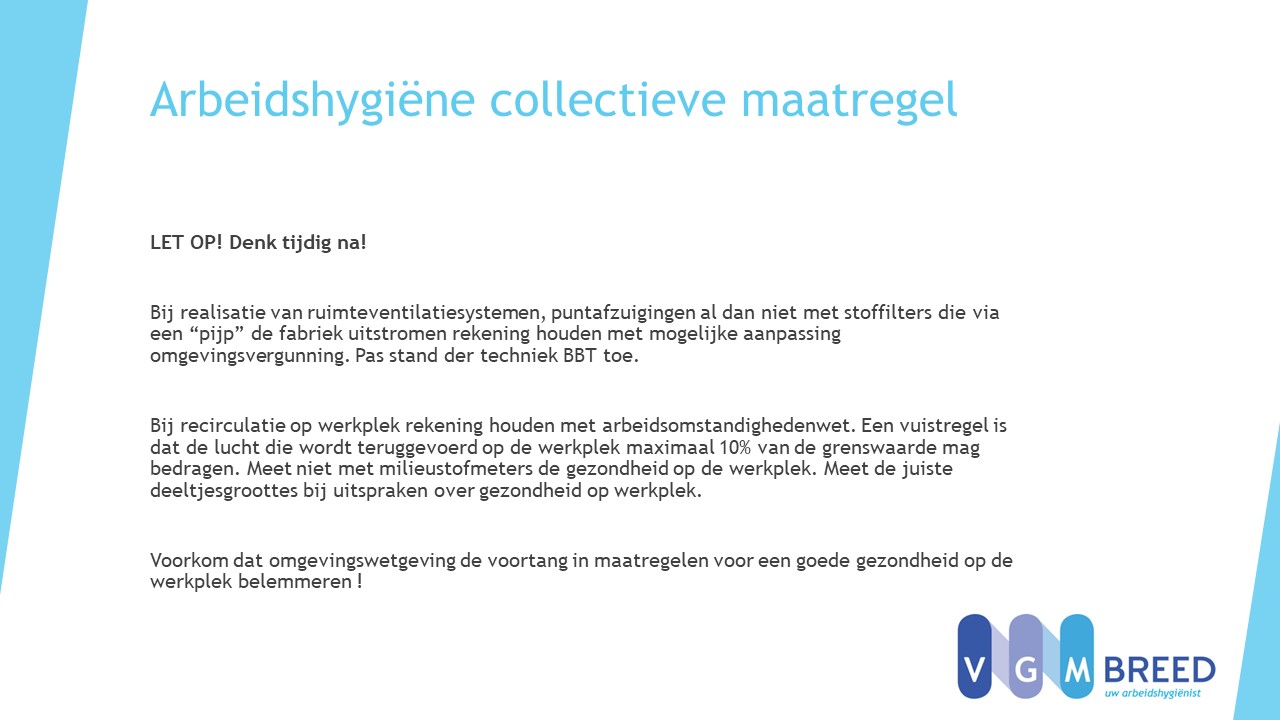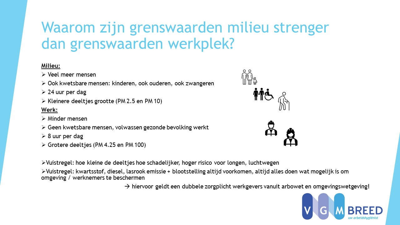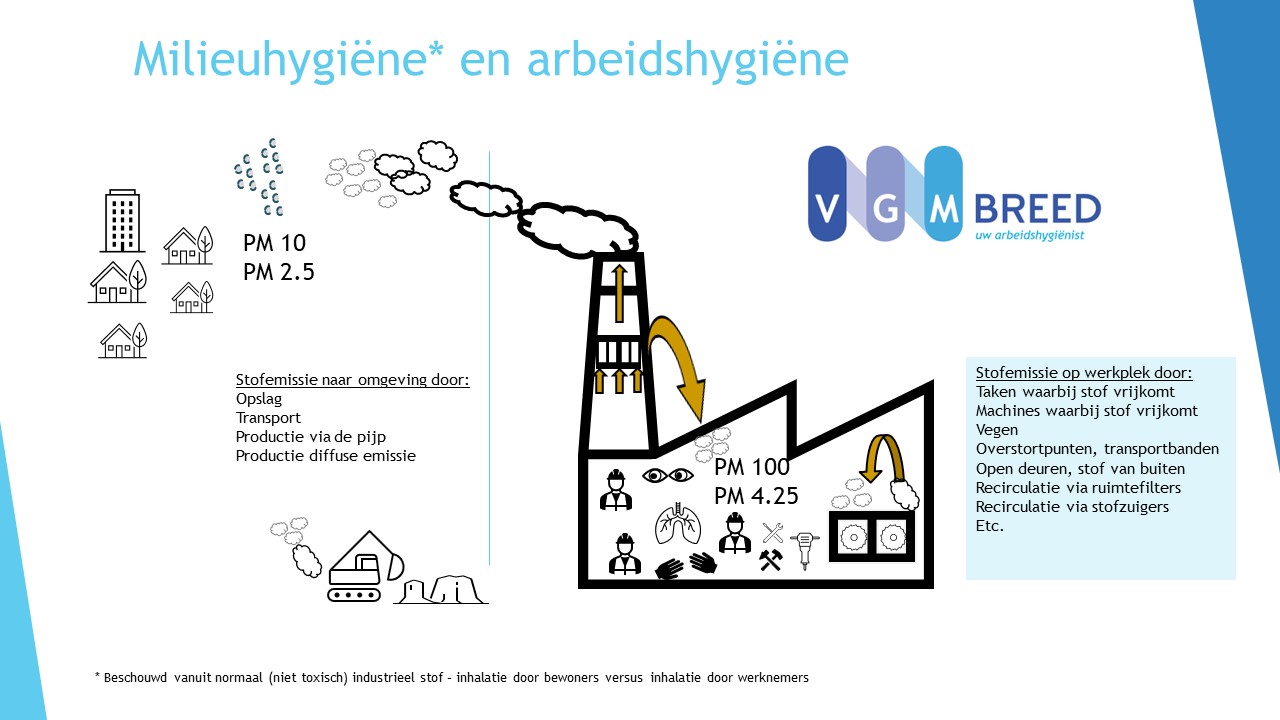 Voor stof geldt dat de deeltjesgrootte waar vanuit milieu wordt getoetst verschilt van de deeltjesgrootte waaraan werkgevers de werkplek op moeten controleren. Ben daarom voorzichtig met het toepassen van milieu- monitoren op werkplekken. Om dit goed uit te leggen heeft VGM Breed een presentatie gemaakt. Graag deel ik deze ook met jullie.