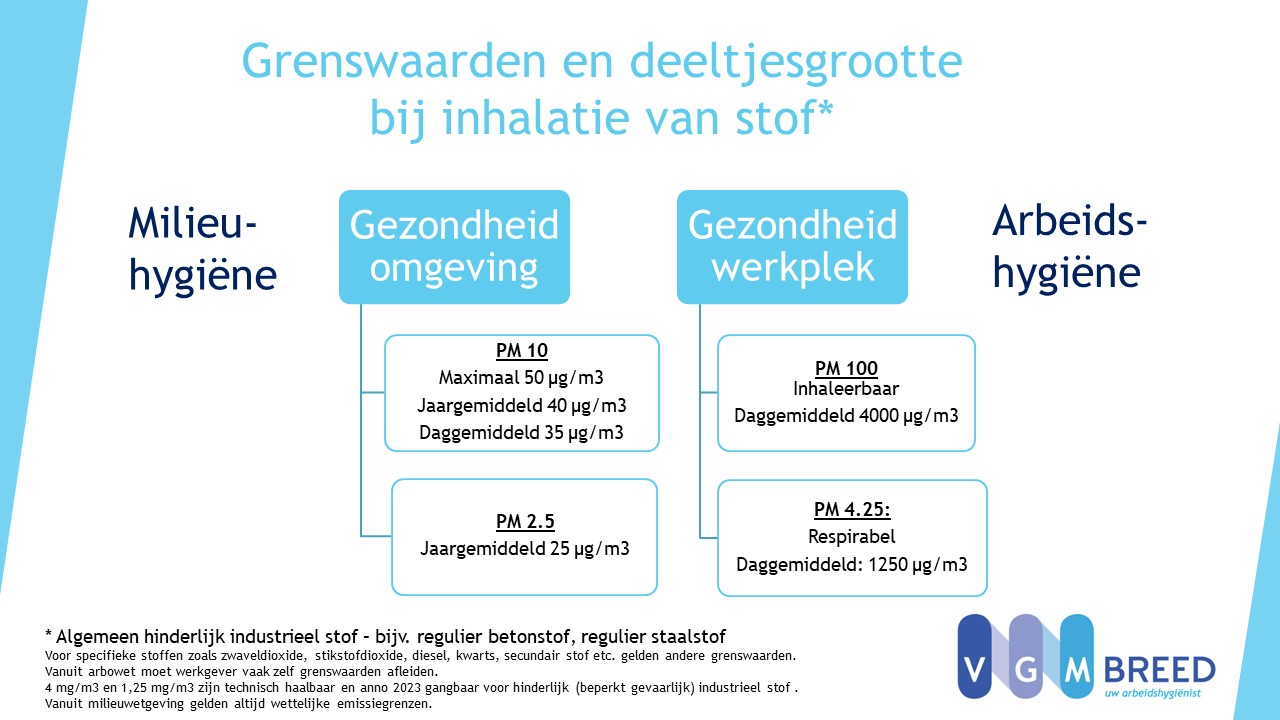 Voor stof geldt dat de deeltjesgrootte waar vanuit milieu wordt getoetst verschilt van de deeltjesgrootte waaraan werkgevers de werkplek op moeten controleren. Ben daarom voorzichtig met het toepassen van milieu- monitoren op werkplekken. Om dit goed uit te leggen heeft VGM Breed een presentatie gemaakt. Graag deel ik deze ook met jullie.